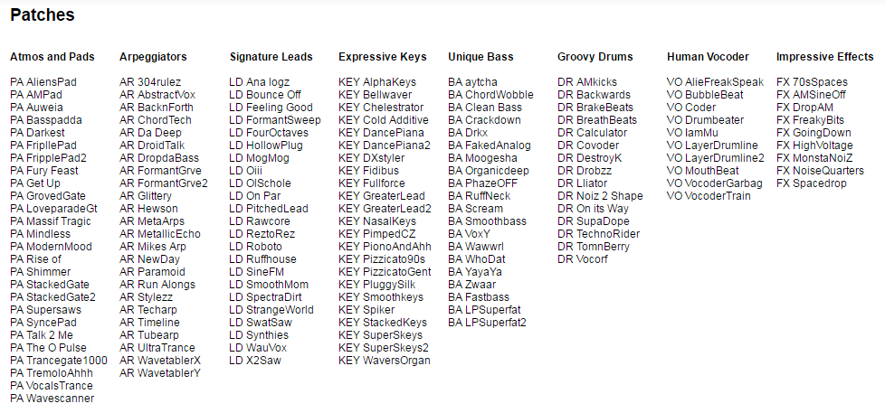 - Evolving pads, expressive keys, inspiring arpeggiators, crisp organic basses, deep atmos, unique leads, rhythmic grooves, humanoid vocoder sounds